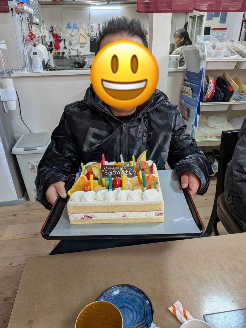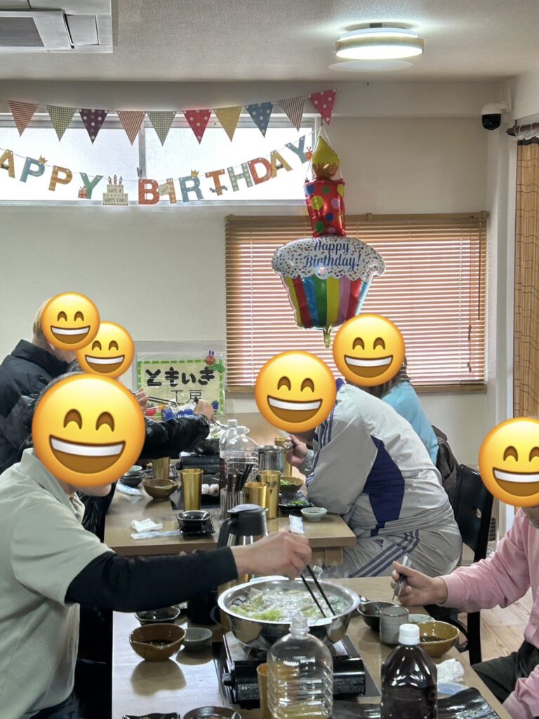 1月のお誕生日会 こんにちは! 1月21日はお誕生日会と新年会を開催しました 国産とらふぐ料理とお誕生日ケーキで皆さん大変盛り上がり 楽しい笑顔をたくさん頂きました。 しゅうへい様、お誕生日おめでとうございます!