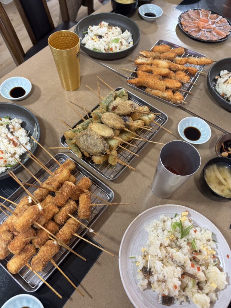 ・うなぎのちらし寿司 ・サーモン造り ・串かつ(サーモン、チーズチクワ、なすび、白ネギ、オクラ) ・野菜のお味噌汁 ・ひなケーキ ・ドリップコーヒー