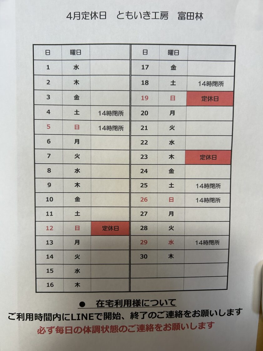 4月の定休日です。